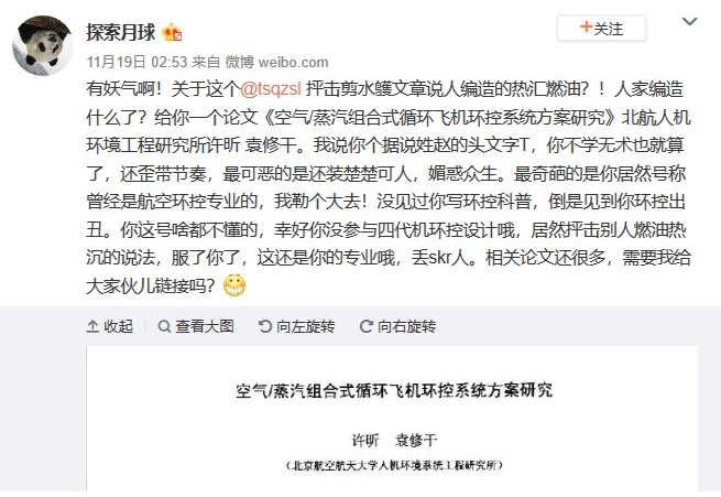 然後,後面就有了更有趣的事情,觀網“方的饅頭”,微博ID“探索月球”要為剪水鸌打抱不平,在沒有搞清楚我反駁剪水鸌的內容情況下,也沒有讀懂論文和發現剪水鸌的謬誤之處,開始來懟我,説我不學無術,這是他的微博截圖: