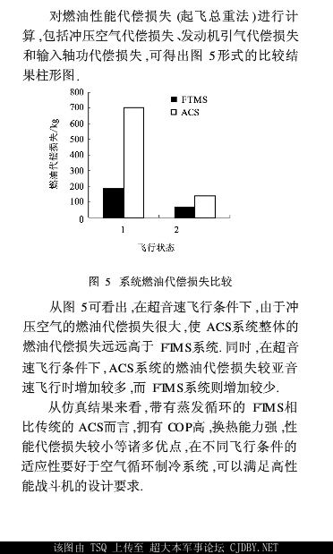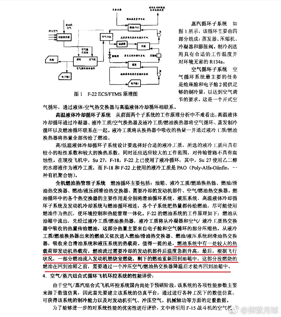 四代戰鬥機(包括F/A-18E/F)為何使用燃油冷卻電子設備?這是因為四代機要考慮隱形而開的口蓋要少,另外四代機的航空電子設備越來越複雜產生熱量大大增加,傳統的空氣製冷效率不高,而四代機的燃油係數普遍較高,利用燃油可以比空氣製冷有更高的效率和減少機身上的口蓋,最後利用燃油冷卻對真正冷卻用燃料更為節省。那麼為何燃油冷卻比傳統空氣冷卻更節省燃料?原因不復雜:傳統空氣冷卻需要從發動機引高温高壓氣體,這些高温高壓氣體通過一些口蓋引入的外界空氣冷卻後再膨脹降温給人員呼吸和電子設備冷卻,在這個過程中,發動機的高温高壓空氣是通過燃燒燃油驅動壓氣機獲得的,需要消耗能量,而冷卻空氣是通過機身上開口蓋引入的,這增加了空氣阻力,進而需要消耗掉髮動機的部分推力;而利用燃油冷卻時,燃油温度上升後被髮動機燒掉,這個冷卻基本不消耗能量,但燃油和電子設備之間進行熱交換過程中的一些熱循環過程需要能量來實現,這些能量也來自於燃油驅動發動機後再變成電能來進行驅動,這部分能量需求折算成燃油並不多,比傳統空氣製冷要少。下面是一些論文中對燃油熱沉和傳統空氣製冷循環的比較,會發現燃油熱沉消耗的能量比傳統空氣製冷循環更少。