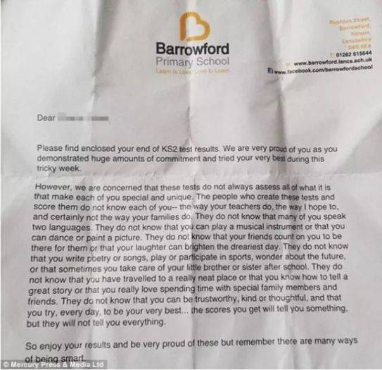 借用英國“拜羅福特小學”(Barrowford Primary School)校長在學生KS2考試(相當於小升初)成績揭曉後,給每個孩子一封信中所提到的:生活裏,有比考試成績更重要的東西,聰明不僅只體現在成績單上。