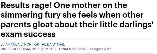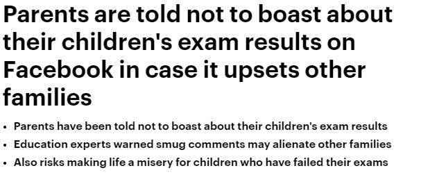 英媒早前就曾報道過,家長們被告知不要在Facebook上吹噓自己孩子的考試成績,因為這會讓其他考得不好的家長感到不安。