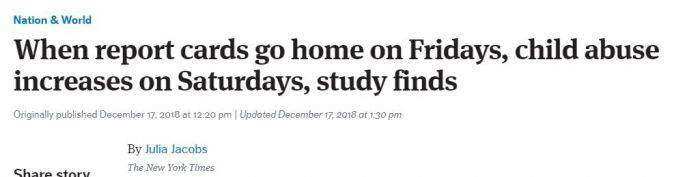 在對64個州成績單的發放時間與“防止虐待兒童專線”接到投訴的近2000個相關虐待案件進行了比對後發現,星期五發成績單後,第二天防止虐待兒童專線接到的骨折、燒傷和其他虐待投訴會翻了四倍。