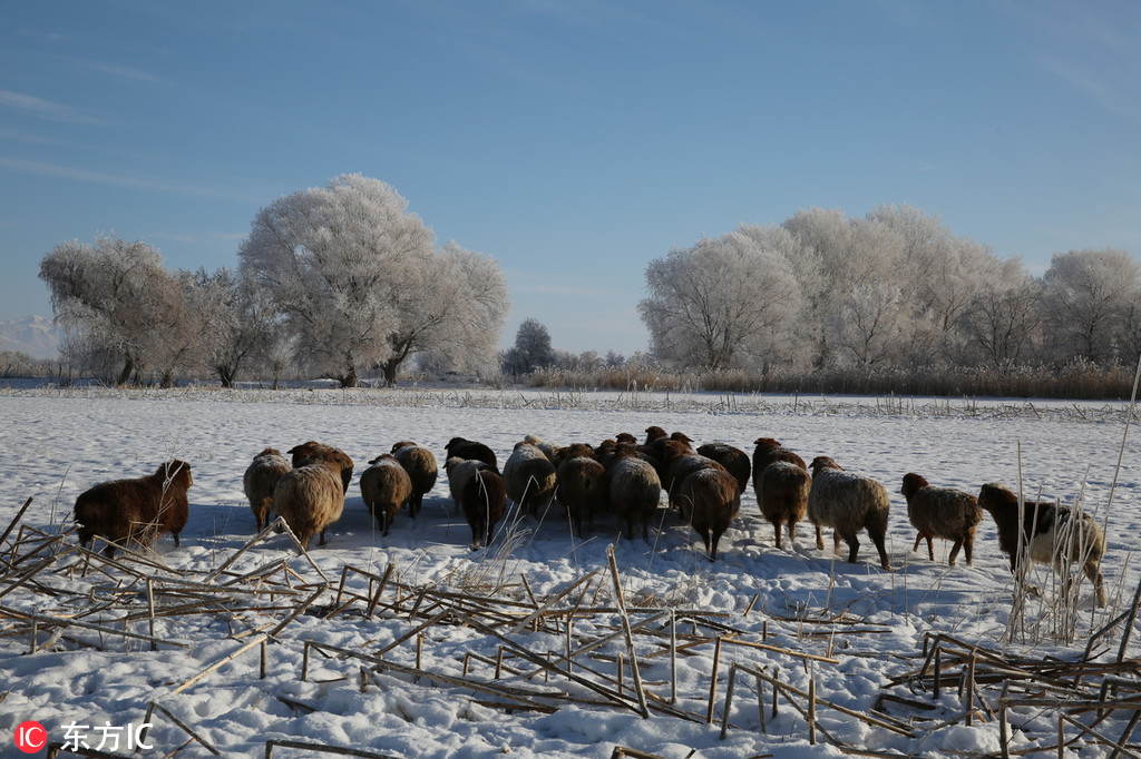 2018年12月18日,新疆阿勒泰市國營第一牧場鄉村出現霧凇景觀,樹木、蘆葦玉樹瓊花,宛若仙境,構成了一副優美的田園畫卷。(@東方IC)