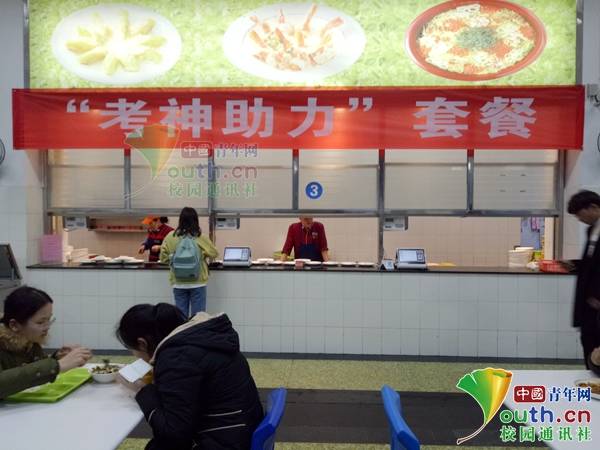 12月15日是2018年下半年大學英語四六級考試時間,14日,在四川農業大學成都、雅安、都江堰3個校區的校園食堂裏,同學們爭相購買“考神助力套餐”,希望吃完這個套餐後可以考個好成績。