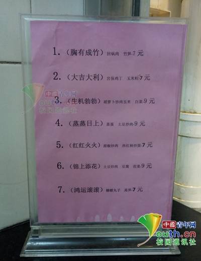 原來,為助力全國大學英語四、六級和研究生考試,該校食堂特於四級考試前夕推出“考神助力套餐”。並新鮮出爐新式菜單——宮保雞丁+玉米粒,寓意“大吉大利”;回鍋肉+竹筍,寓意“胸有成竹”,胡蘿蔔炒肉+玉米+白菜,寓意“生機勃勃”;蒸蛋+土豆炒肉,寓意“蒸蒸日上”!不少學生表示考試前夕學校藉此緩解學生複習壓力,實在暖心!