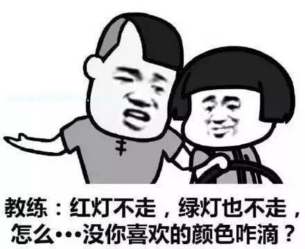 練路考碰到等紅綠燈,綠燈亮了好久,離合一直慢慢抬,車子一直不走,教練來了句:“怎麼,沒有你喜歡的色兒啊?”