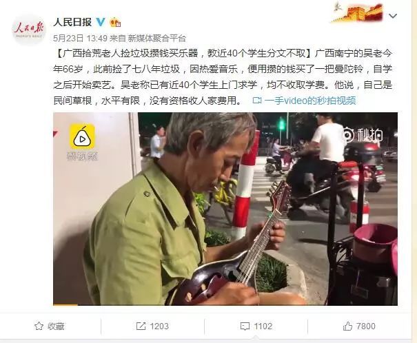 廣西南寧的拾荒老人吳老今年66歲,因熱愛音樂,他靠拾荒攢的錢買了一把曼陀鈴,自學成才在街頭演奏。由於演奏水平高,他還得到當地高校音樂系一位副教授的讚賞,對方專程趕來聽他彈奏了一曲《莫斯科郊外的晚上》。先後有將近40名學生上門拜師學藝,他都耐心教學且分文不取。