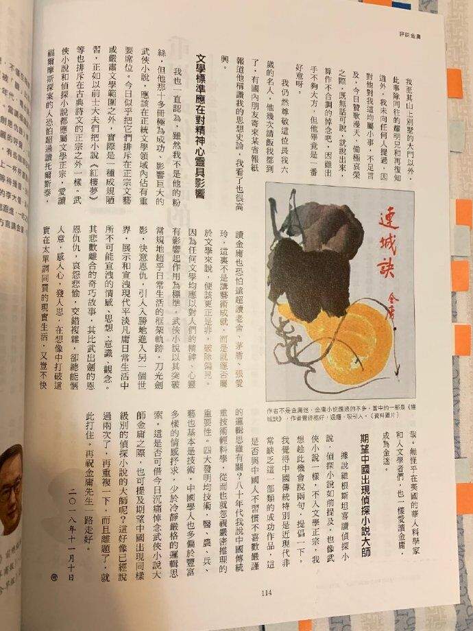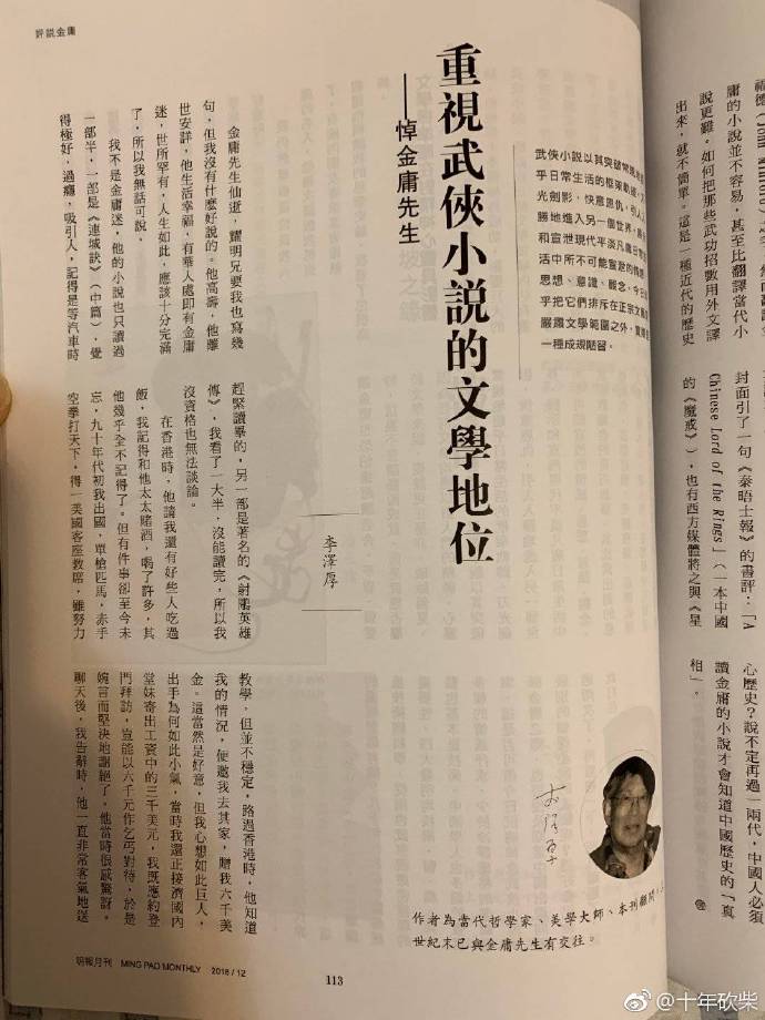 著有《美的歷程》等作品的著名哲學家李澤厚教授也寫了一篇悼文,文中提到了上世紀90年代初,他與金庸先生的一段往事。