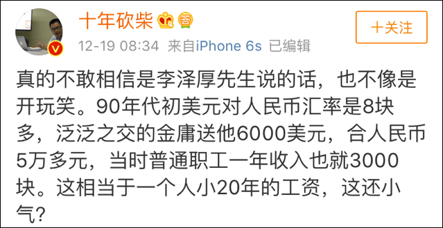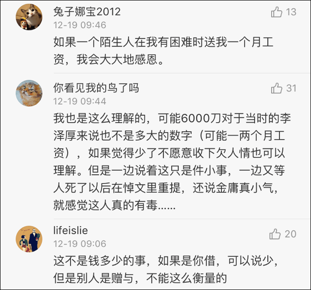 我個人的看法是,別人願意無償資助自己,一般人都會覺得很感激吧。嫌少還記了這麼多年……只能説李澤厚先生不是一般人,“偶像包袱”是真的重……
