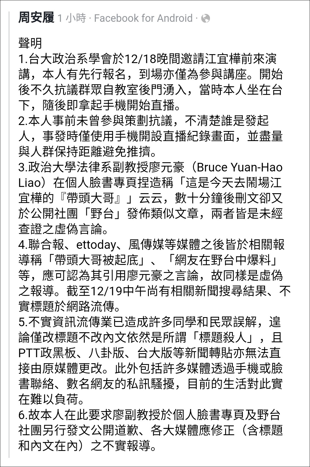 對此,周安履在19日下午1時許發聲明回應表示,自己先前有報名參與活動,並非鬧事分子從外介入。而在事情發生後,第一時間進行直播,也並不是參與策劃抗議。可以注意到,在周本人臉書上,在該聲明之前有兩則貼文都是江宜樺演講受到抗議的直播影片。