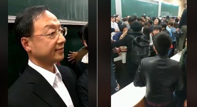 學生受訪表示,今天演講開始不到半小時,突然有大批學生衝入教室內,燈光也突然變暗,之後熒幕開始播放“太陽花學運”時警察與學生對峙過程的影片。