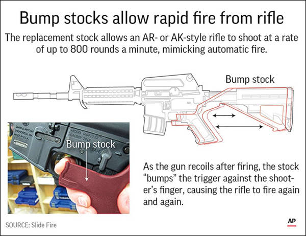 特朗普政府下令禁售撞火槍托(bump stock),該裝置可以將半自動槍械改造成全自動武器。該禁令在2017年賭城慘案一年多以後才被髮布。