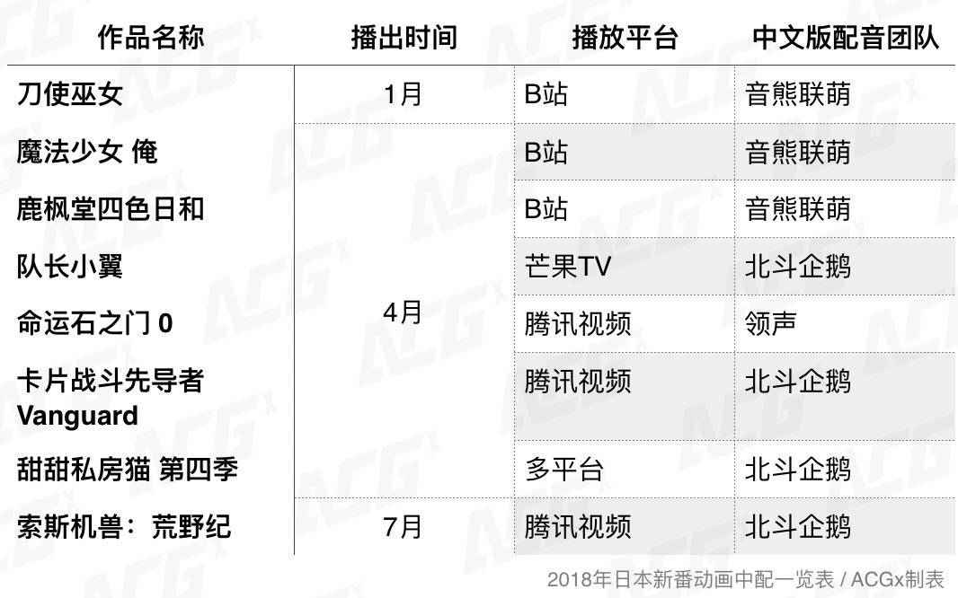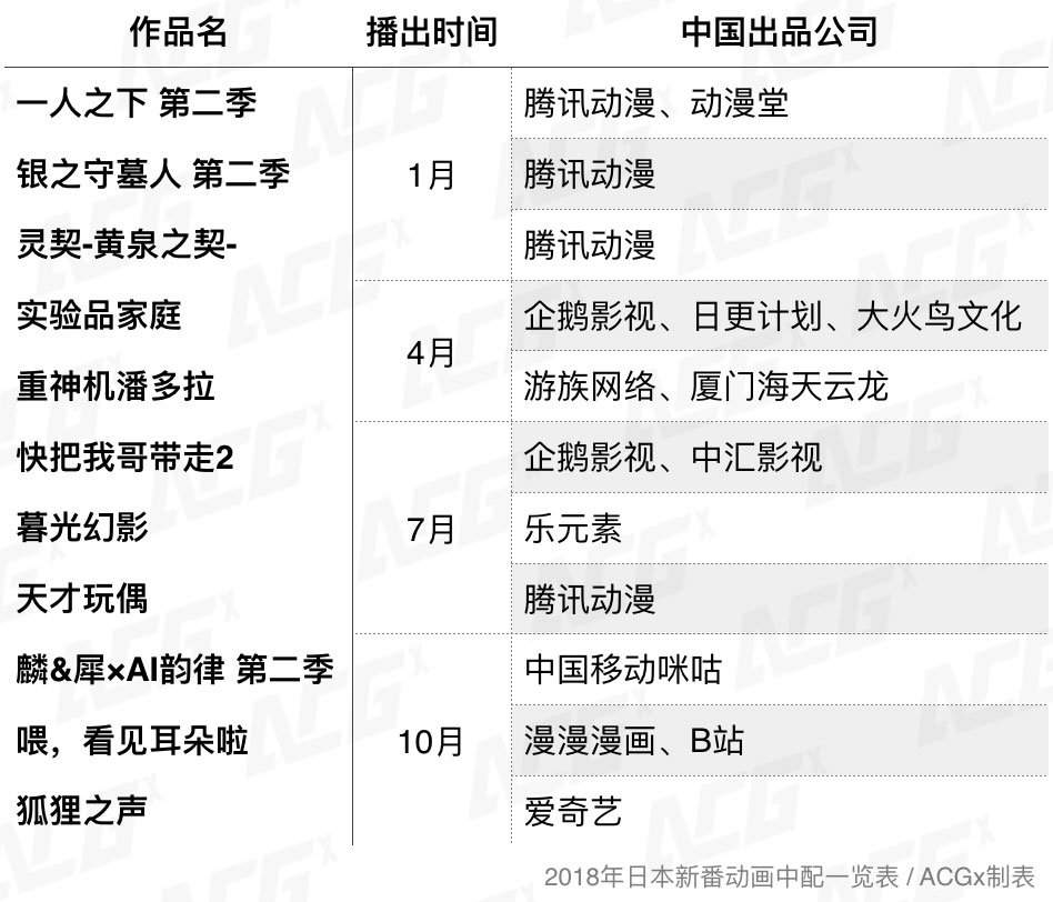 在2018年4月,很多中國的動漫愛好者都注意到了部分新番動畫推出中配版的情況。據ACGx不完全統計,在2018年推出且具有中配版的新番動畫,有以下幾部: