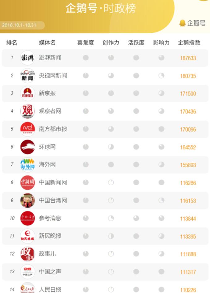 企鵝號的運作模式和頭條號差不多,作者在企鵝號發佈的內容等於授權騰訊轉載到到天天快報(騰訊旗下類似今日頭條的軟件)、騰訊新聞和QQ空間等平台。這個排名只有分類榜,以下是十一月發佈的數據,觀察者網在時政類的第四名。