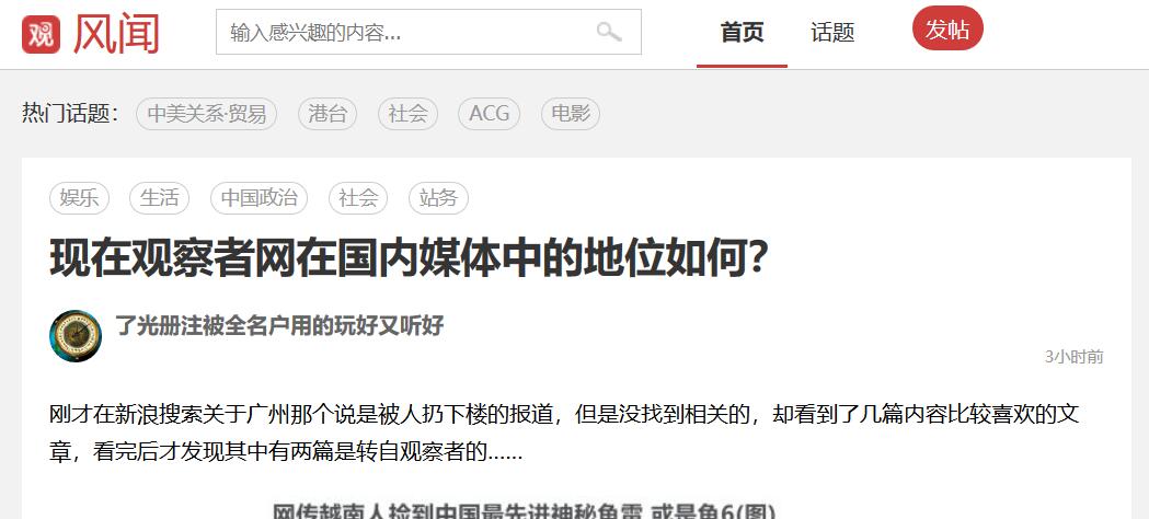 看到下午有人在問,現在觀察者網在國內媒體中的地位如何?