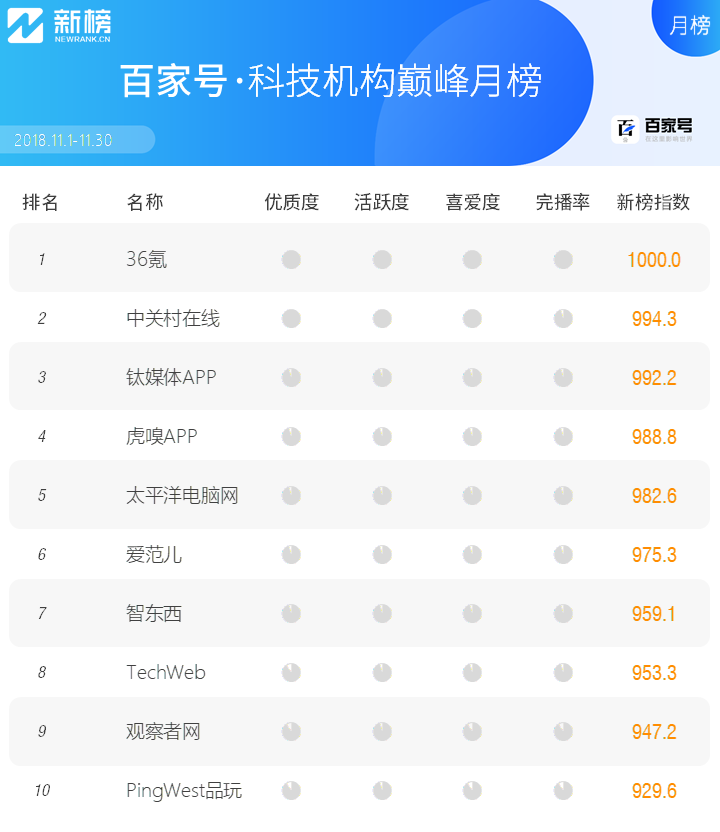 至於百家號……百度對自家產品的定位本身就非常一言難盡,再加上內容紛雜無序,所以百家號的數據並不像頭條號、企鵝號那麼有意義。另外,在我能找到的榜單中,竟然把觀網放了科技媒體的分類中,也不知道是百度的鍋還是新榜的鍋,大家將就看一下: