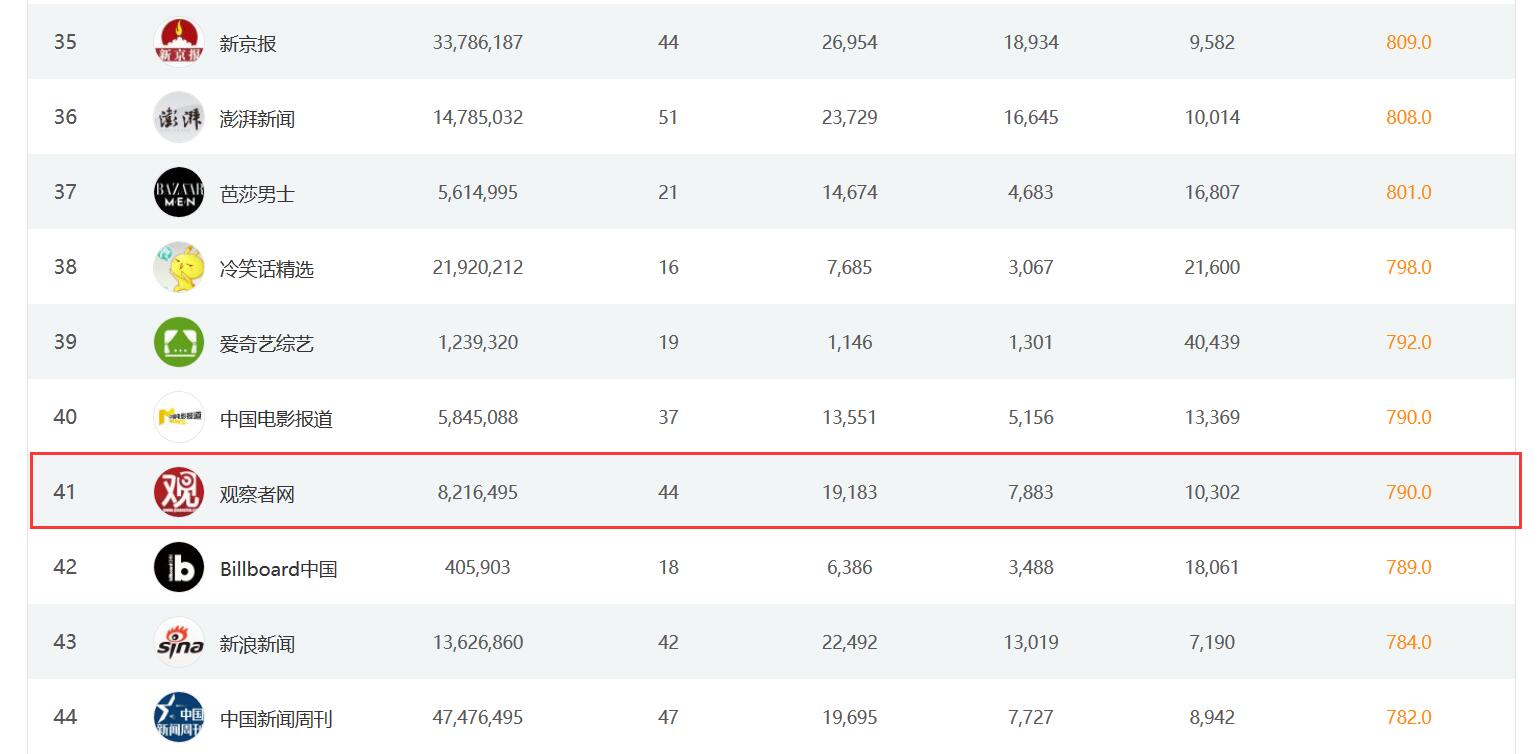 如果要説一個媒體的好壞功過、價值取向,這可能沒有一個客觀的評價標準,但如果只是討論其地位和影響力,還是能從各個平台上的數據反映出來的。現如今有不少公司專門做新媒體數據的分析,所以要查到觀網的數據還是很容易的。
