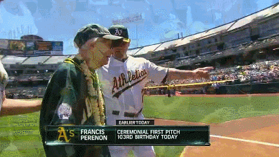 你以為101歲的開球少女是最年長的了嗎?不不不。同年,地處灣區的奧克蘭運動家隊還邀請了一位103歲的婆婆,在她生日當天為運動家隊開球。在老壽星的庇護之下,他們也在那一年打出了完美的上半賽季。