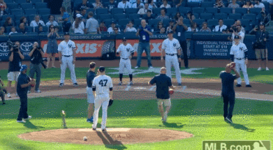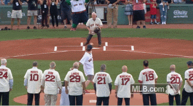 看不懂沒關係,反正你知道**不管開球嘉賓把球投成什麼樣,拿球棒的打者都要揮一下棒子以示尊重就行。**但這裏注意,開球嘉賓有時候不一定是一個人,可能是三個人: