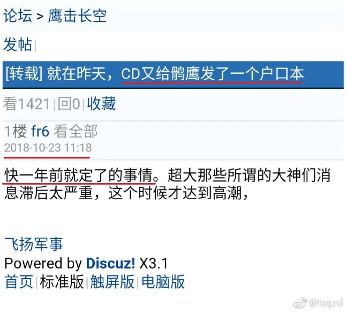 實際上啊,每個論壇都有了解情況的人,知道一些消息。當然,一些人有各自立場,所以這個時候有趣事情出現了。譬如下面截圖(見文章最後),有人已經很早就知道信息,可能很早也在某論壇説過,但是估計是某些網民不當回事,然後還是繼續以黑沈飛和黑鶻鷹為樂。而由於立場的原因,這些知道情況的人也不去糾正,然後某些網民就鬧出各種笑話似的傻樂呵。記得前幾天某個“大神”説過鶻鷹的事情,説的不靠譜,我還反駁過。當然,該“大神”由於説鶻鷹的事情符合某論壇網民的期望,所以就被奉為真神。然後這個“真神”也被下面圖中的人笑話了一下,圖就不截了。