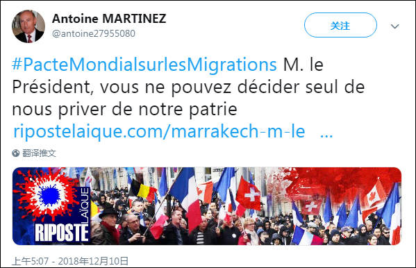 Antoine Martinez在信中寫道,兀自簽署這份旨在推動安全、有序、定期移民的全球契約,將使馬克龍犯下違反民主和叛國的罪行,將使憤怒的人民更有理由站起來反抗,使法國喪失移民政策方面的主權。