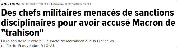 據法國《新觀察家(L’Obs)》12月19日報道,為批評法國總統馬克龍,反對其簽署促進移民事務合作的聯合國協議,十幾位將軍在公開信中使用了上述字眼,但被指過於粗暴。