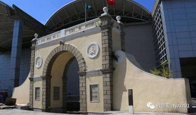 這座拱門是歷史上大陸同澳門的分界。現位於邊檢澳門一側。你們先通過拱北邊檢大樓出境,接着步行百多米到澳門邊檢大樓入境。走出澳門邊檢大樓,便能看到一座巴黎凱旋門式樣的黃色拱門。當然比凱旋門要小得多。注意拱門上的碑刻文字以及門楣上的文字,你們學過西班牙語,應該瞭解文字的意思。還有面向澳門方向牆壁上的徽記,最好照些照片。然後我再慢慢向你們解釋。