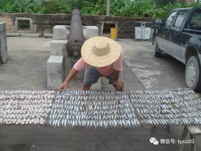 漁民們擺開攤子,賣醃好的大魚。擁擠的海貨攤子,緊靠着一個炮台。三合土的低牆上,鑄造的鐵炮對準大海。真的,鐵炮就在鹹魚背後矗立!