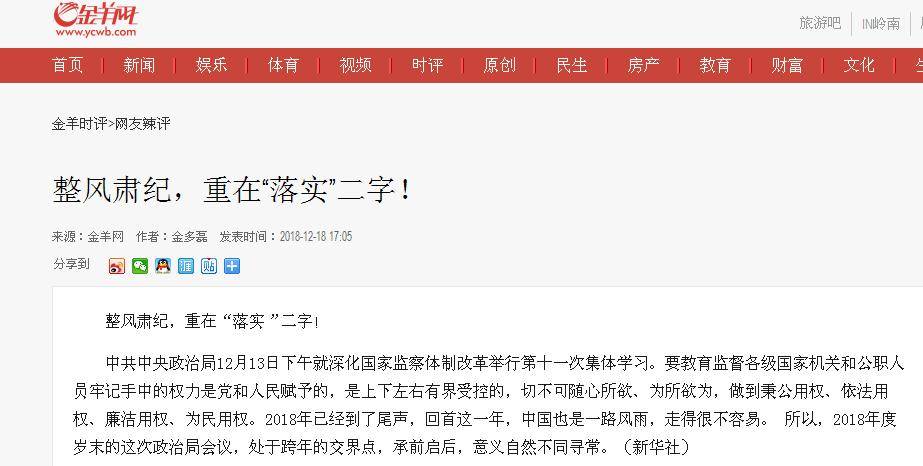 中共中央政治局12月13日下午就深化國家監察體制改革舉行第十一次集體學習。要教育監督各級國家機關和公職人員牢記手中的權力是黨和人民賦予的,是上下左右有界受控的,切不可隨心所欲、為所欲為,做到秉公用權、依法用權、廉潔用權、為民用權。2018年已經到了尾聲,回首這一年,中國也是一路風雨,走得很不容易。 所以,2018年度歲末的這次政治局會議,處於跨年的交界點,承前啓後,意義自然不同尋常。(新華社) 推進全面從嚴治黨,就必須從各級黨員幹部作風着手。黨的作風事關黨的形象,事關黨的興衰成敗。作風建設要深化,首要一條是各級領導幹部尤其是一把手必須從我做起,帶頭轉變作風,力戒享樂主義和奢靡之風,有效防範形式主義、官僚主義,堅決反對特權思想、特權現象,嚴格約束自己,嚴格家教家風,始終做到密切聯繫羣眾,形成以上率下的“頭雁效應”。 客觀來看,總體上講,原有的紀檢監察體制,也是手執了“尚方寶劍”,在監督執紀、反腐敗鬥爭等工作中敢於亮劍,強力地整風肅紀,純潔了幹部隊伍,為改革開放以及社會經濟日新月異地發展,作出了強有力的支撐保障。但不可否認的是,也凸顯了一些問題。這些問題,極大地削弱了“尚方寶劍”的戰鬥鋒芒。 值得注意的是,日前廣東省紀委監委出台《紀檢監察機關集中整治形式主義、官僚主義工作措施》,提出建立問題清單、深挖問題線索、嚴肅執紀問責、深入推進治理4個部分共16條具體措施,集中整治形式主義、官僚主義問題。由此可見,體現出省紀委監委英明決策對避實就虛、高舉輕放、弄虛作假、推諉塞責等形式主義、官僚主義行為開始進行較真。 **正人先正己,己身不正,何以正人。事實,我們應該從輿論鬧得沸沸揚揚、揭陽“問題氧”事件清醒地意識到,在執紀監督上既要立足事實又要讓民眾安心消費者舒心,決不能再犯“糊塗”。**所以,四風”問題具有很強的頑固性和反覆性,一些地方和部門不正之風仍然易發多發,老問題樹倒根在、隱形變異花樣翻新,形式主義、官僚主義的危害進一步凸顯。 現實中,出現負面情況,一些地方首先想到的不是坦誠面對、主動擔當、立行立改,以負責任的態度贏得支持認可,而是將防控工作擺在第一位對待。這顯然是一種本末倒置。實踐證明,這樣的應對之道,公眾很難買賬,對於解決實際問題也毫無裨益,反而會因為拒絕監督權力的傲慢,從而加劇炙烤。 比如,12月14日出版的《北海日報》在頭版刊文《嚴肅整頓作風 爭創全國最優營商環境》提到,12月13日下午,市委召開整頓工作作風優化營商環境工作會議,通報對市行政審批局政務服務大廳等窗口單位暗訪檢查的情況和我市優化營商環境考評指標完成情況,宣佈對市行政審批局班子集體免職的決定。此文一出引起公眾高度好評。 **空談誤國,實幹興邦。切實依紀依規解決揭陽“問題氧”事件,就是依法治國的試金石。**法治興則風氣正,法治強則綱紀明,不斷提高領導幹部法治思維和依法辦事能力,營造良好政治生態就有了堅實基礎。 對那些陽奉陰違,説一套做一套,不幹實事,欺上瞞下,公然違反中央八項規定就必須堅決説不。 光打雷不下雨,只喚口號不見落實,這種作風要不得。“一分部署,九分落實”。好作風的形成不是一朝一夕之事,必須抓常、抓細、抓長,必須從人民羣眾關心的、久而未決的難事困事着手,緊盯不敬畏、不在乎、喊口號、裝樣子的問題,堅決破除形式主義、官僚主義,要有力削減存量、有效遏制增量,鞏固發展反腐敗鬥爭壓倒性勝利,整治羣眾身邊腐敗和作風問題。 **“善除害者察其本,善理疾者絕其源”。**形式主義、官僚主義從本質上看,無疑損毀黨和政府的形象。不僅如此,還會帶壞工作風氣,遠離基層和羣眾,可謂危害甚焉,萬萬要不得。 **整治形式主義、官僚主義,已成民心所向大勢所趨。**關鍵在於各地各部門要認真強化紀檢監察,隨時強力“掃描”各級幹部,尤其是各級領導幹部的作風問題,發現違背中央八項規定,以各種手段搞“四風”,讓形式主義、官僚主義上身者,就要依法依規嚴查嚴管嚴抓,絕對不能手軟。只有消除形式主義、官僚主義,我們才能切實牢固黨的執政根基,不斷實現全心全意、實心實意為人民服務的宗旨。 **律人者必先律己,執紀者必先守紀。**接受輿論監督,來不得半點假把式,不僅是這樣説,更是要這樣做。它體現在工作中的方方面面。比如,要暢通輿論監督的渠道,面對公眾的監督、舉報及時走訪調查,或出具有説服力的回應,或出台改進措施,切實滿足公眾的知情權、監督權。再比如,要習慣在監督的“聚光燈”下工作,藉以規範自身言行,規範權力運行,堅決不讓“慢作為”“不作為”“虛作為”“偽作為”“亂作為”有市場。 **在切實加強“自我監管”上落實監督責任。**這説明,貫徹中央八項規定,糾正“四風”,必須盯住形式主義、官僚主義這個老問題不放,也必須實行猛藥除痾之策,既要下決心與之決裂,又要打持久戰堅決剷除。要讓黨中央重大決策部署落地見效,關鍵要有抓鐵有痕、踏石留印的恆心持續、深入、全面改進作風。千道理萬道理、落實才是硬道理,最後落腳點就兩個字:“落實” !最終看成效,作風好不好,關鍵看領導,等等,這些深刻的認知形成和堅定的決心表達,都是黨和人民心聲的充分釋放。(金多磊)文章來源連接;http://sp.ycwb.com/20