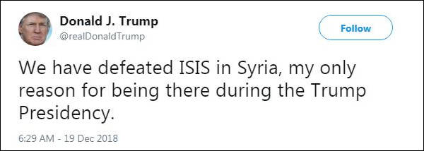 特朗普下令美軍撤出敍利亞,他宣佈已經擊敗了當地的ISIS。