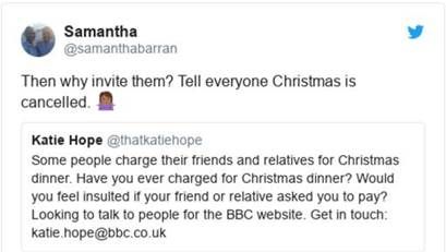 另一位網友Daniella表示,她的婆婆按人頭收費,每人40鎊,但是自己9歲的兒子可以免費,“當時我都震驚了,但自從那次之後我們就沒去過她家聚餐了。”