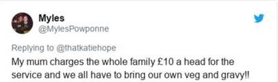 Myles認為收取服務費很奇怪但想想前後準備、洗碗做飯等等,還可以理解,但是這種行為很分裂家庭感情,他在推特上説道,“我媽要向來賓收取每人10鎊服務費,我們還要自備蔬菜和醬汁。”