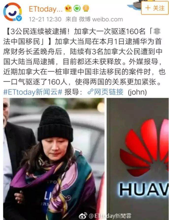 今天,一直也"碰瓷"華為高管孟晚舟被抓事件的台灣省媒體,又一驚一乍地拋出了一個聳人聽聞的消息,稱加拿大為了報復3名該國公民被抓一事,一次性從該國驅逐了160名中國人。
