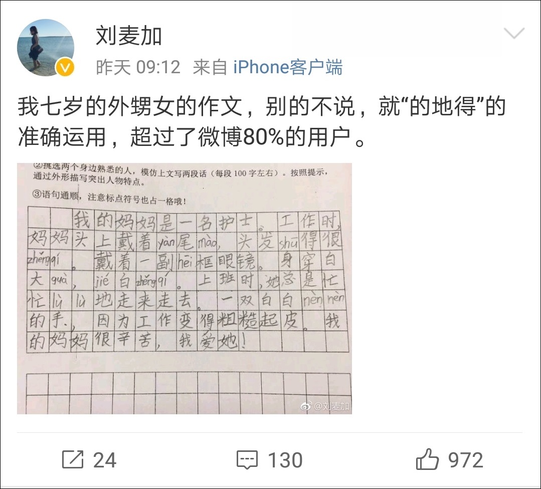 昨天在微博上看到作家劉麥加分享的自己七歲外甥女寫的一份小作文,她讚賞自己的外甥女:“別的不説,就‘的地得’的準確運用,超過了微博80%的用户。”