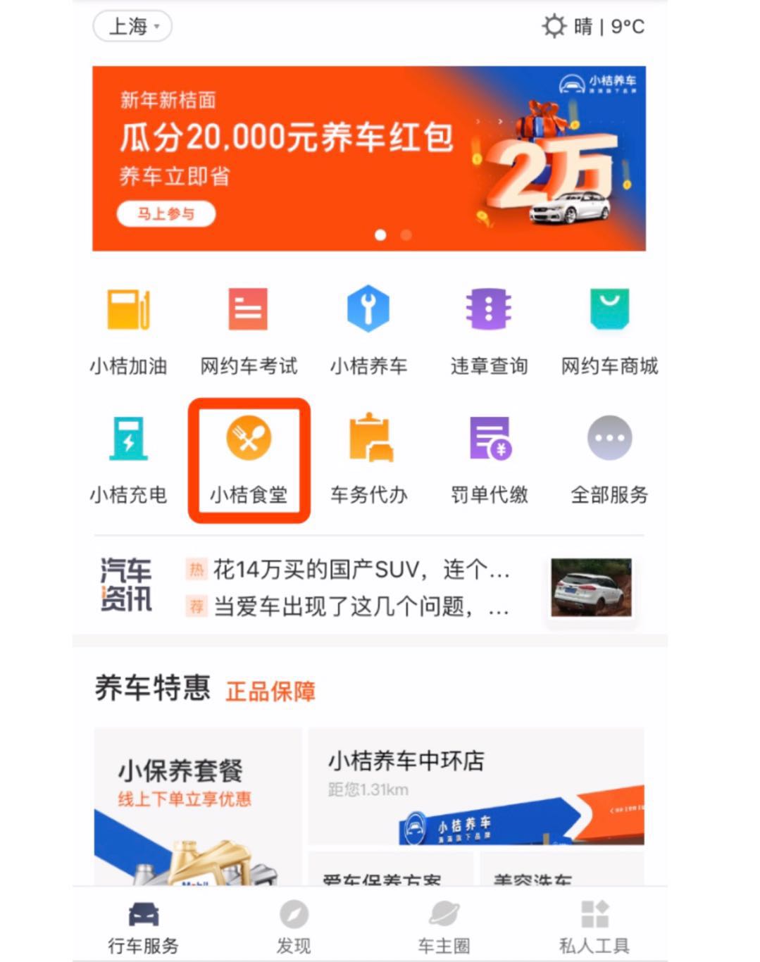 現在,只要打開滴滴車主APP,點擊“車生活”進入“小桔食堂”界面,即可查看全上海“小桔食堂”具體位置。