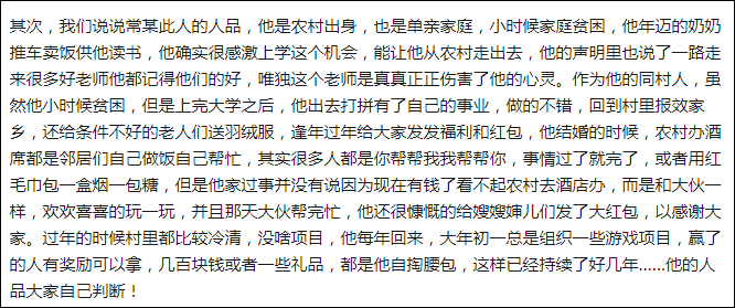 他上完大學之後,他出去打拼有了自己的事業,做的不錯,回到村裏報效家鄉,還給條件不好的老人有送羽絨服,逢年過年給大家發發福利和紅包。……過年的時候村裏都比較冷清,沒啥項目,他每年回採,大年初一總是組織一些遊戲項目,贏了的人有獎勵可以享,幾百塊錢或者一些禮品,都是他自掏腰包,這樣已經持續了好幾年。
