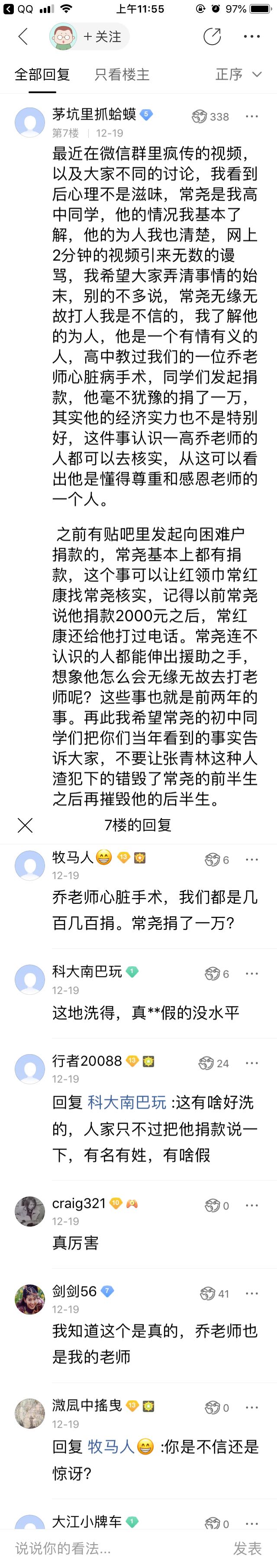 他們曾經的高中老師,喬老師因為心臟病要做手術,同學們發起捐款,常堯毫不猶豫捐了一萬。按@牧馬人的説法,其餘同學都是幾百幾百的捐助。