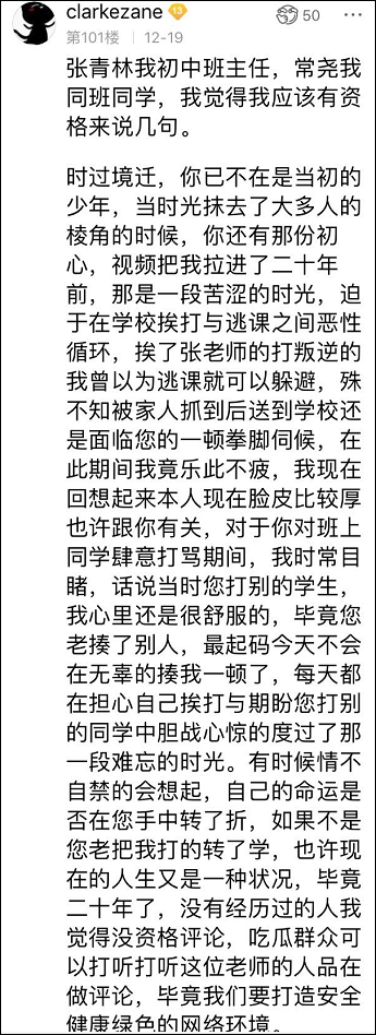 @clarkzane也是常堯的初中同學,他稱視頻將自己拉進了20年前,當時他認為逃課可以避免張青林的拳打腳踢,但被家人抓到之後,還是躲不過張老師的拳腳伺候,現在想起來“本人臉皮比較厚”也許和張老師有關。