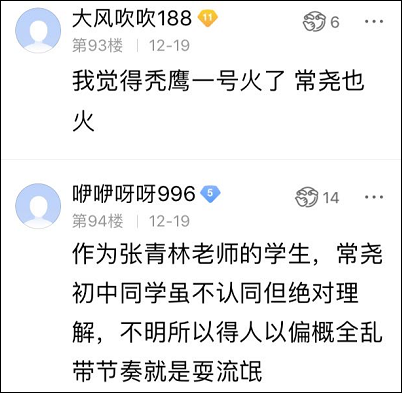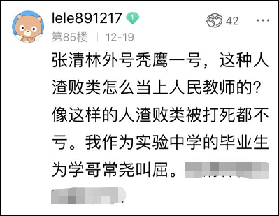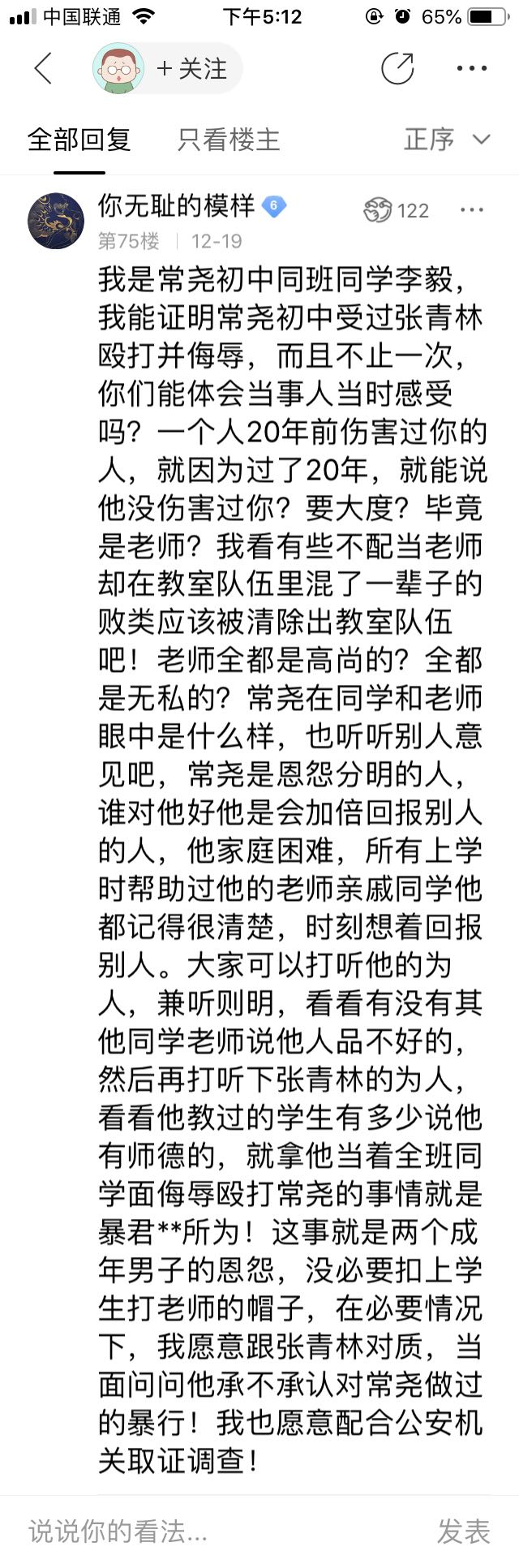 在該貼下,諸多實驗中學(張青林任教)的學生,稱自己目睹過張青林毆打學生,並送外號“禿鷹一號”,大家為常堯“叫屈”。