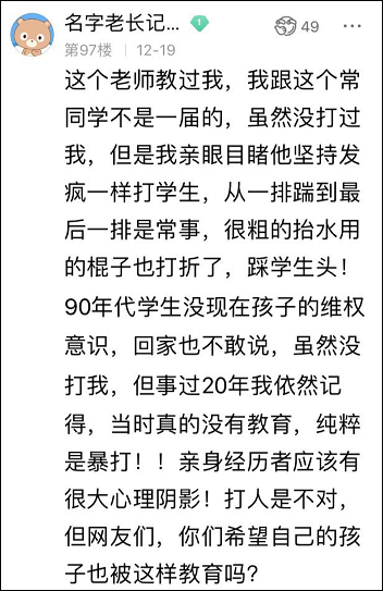 我親眼目睹他發瘋一樣打學生,從一排踹到最後一排是常事,很粗的抬水用的棍子也打折了,踩學生的頭!