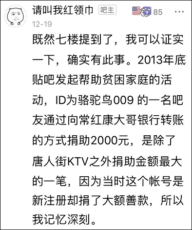 經欒川吧吧主確認,常堯確實還曾在貼吧為貧困家庭捐款2000元,是除了當地一家KTV之外捐助金額最大的一筆。並且因為當時@駱駝鳥009這個賬號新註冊卻捐助了大量善款,所以讓吧主印象深刻。