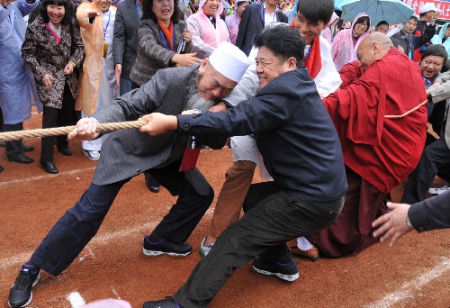 其實,我們國家各宗教和諧相處的事情並不少見,比如説下圖是“第二屆宗教界體育運動會”的一場拔河友誼賽,你能發現圖中出現了哪幾個宗教嗎?