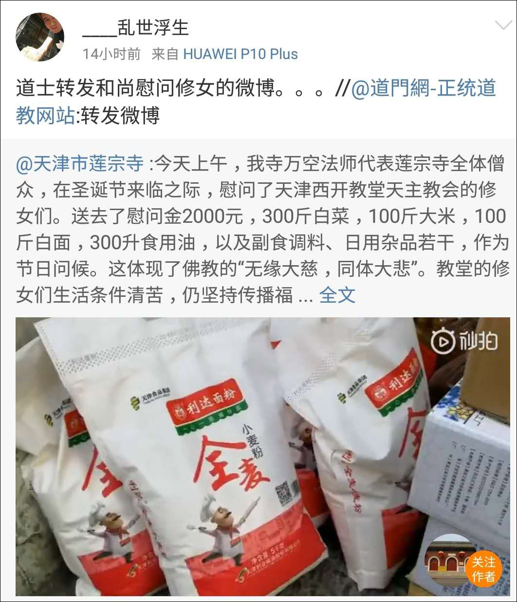 隨後,道門網的官方微博也轉發了這條消息。有網友評論道,道士轉發和尚慰問修女的微博。