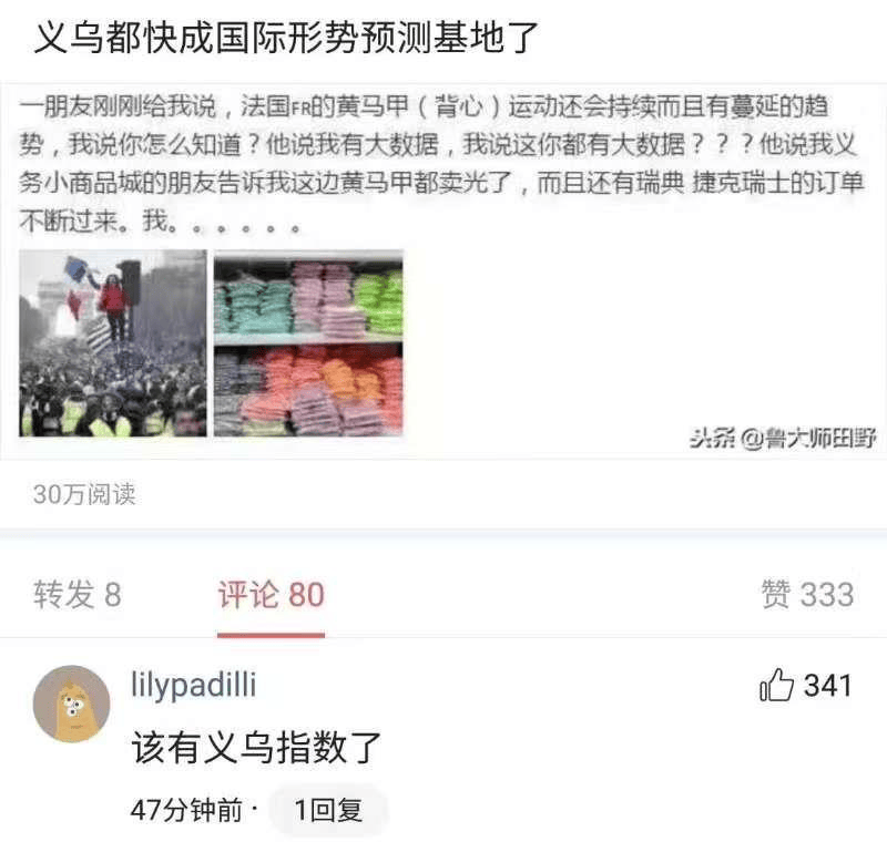 【環球時報-環球網報道 記者白雲怡 謝雋】這兩天,你可能也被這樣一條神蹟般的消息刷屏了:“義烏快成國際形勢預測基地了!一朋友剛剛給我説,法國的黃馬甲運動還會持續而且有蔓延的趨勢,我説你怎麼知道?他説我有大數據,我説這你都有大數據???他説我義烏小商品城的朋友告訴我這邊黃馬甲都快賣光了,而且還有瑞典捷克瑞士的訂單不斷過來……”