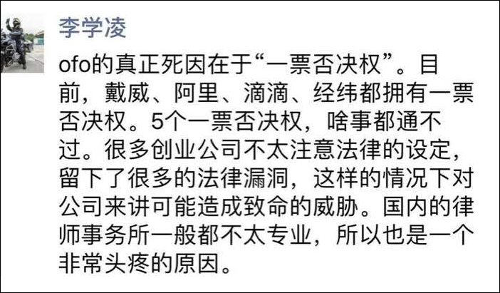 歡聚時代董事長兼CEO李學凌也在其朋友圈發出了相同的觀點,稱ofo真正的死因在於“一票否決權”。