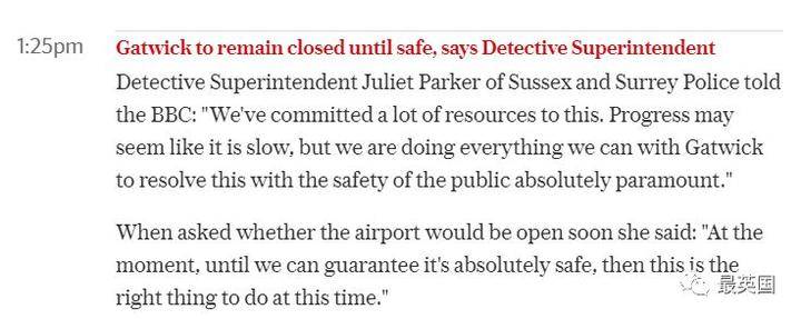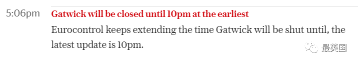 蓋特威克機場下午5:06消息稱,機場會一直保持關閉,最早也要等到晚上10點恢復開放了。