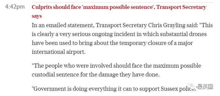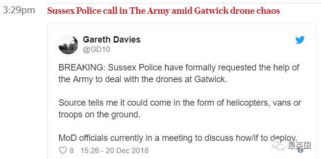 “兩架無人機約週三晚9點飛至蓋特威克機場附近,從週三21:03至週四3:01機場關閉。不幸的是,在機場附近又發現了無人機,迫使機場於3:45再次關閉,我們正與蘇塞克斯警方調查這一事件。”