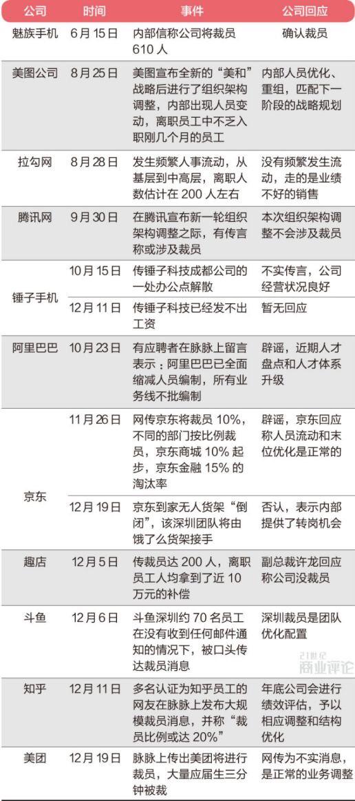 和寒流一起到來的,是互聯網企業減員的消息。從知乎、錘子、美團到京東、騰訊、阿里,據《21CBR》記者統計,過去的半年裏,至少有11家企業相繼被傳裁員消息。