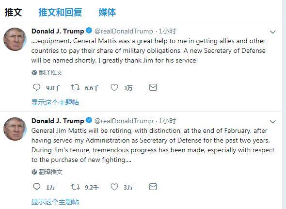 美國當地時間本週四,特朗普連發兩條推特,宣佈美國國防部長馬蒂斯將於明年二月底離職。