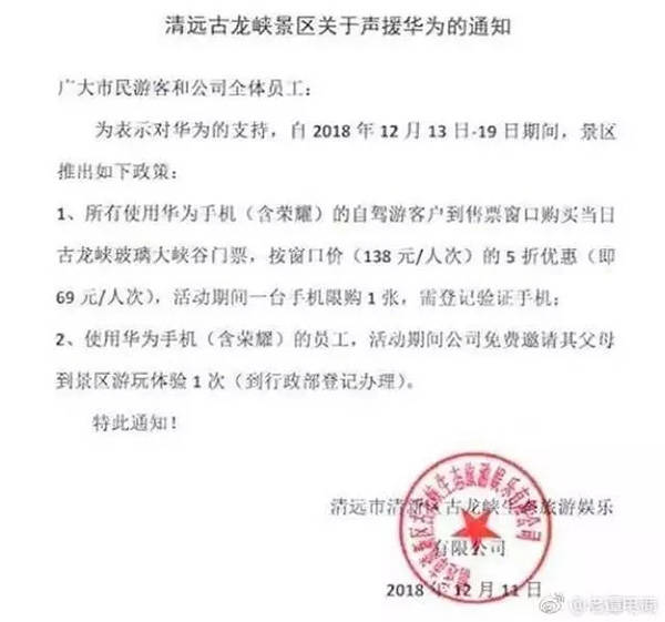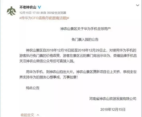 據瞭解,首先發布公告的是河南神農山景區。12月15日,河南神農山風景名勝區管理局官方微博發佈《神農山景區關於華為手機全球用户免門票入園的公告》。公告稱,神農山景區自2018年12月16日起至2018年12月29日止,對使用華為手機的遊客執行免門票的價格政策。