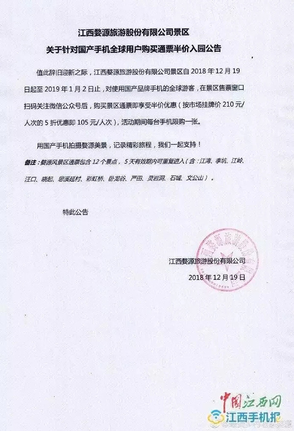 江西婺源旅遊股份有限公司景區也發佈信息,自2018年12月19日起至2019年1月2日止,對使用國產品牌手機的全球遊客,在景區售票窗口掃碼關注公眾號後,購買景區通票即享受半價優惠,該通票其中包涵一個5A景區,7個4A景區。活動期間每台手機限購一張。